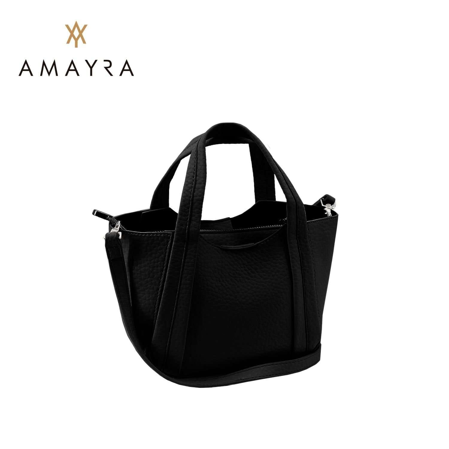 Cartera Amayra chica negra. Tiene un sobre interno sujeto con dos imanes. Manijas cortas y correa regulable del mismo material.